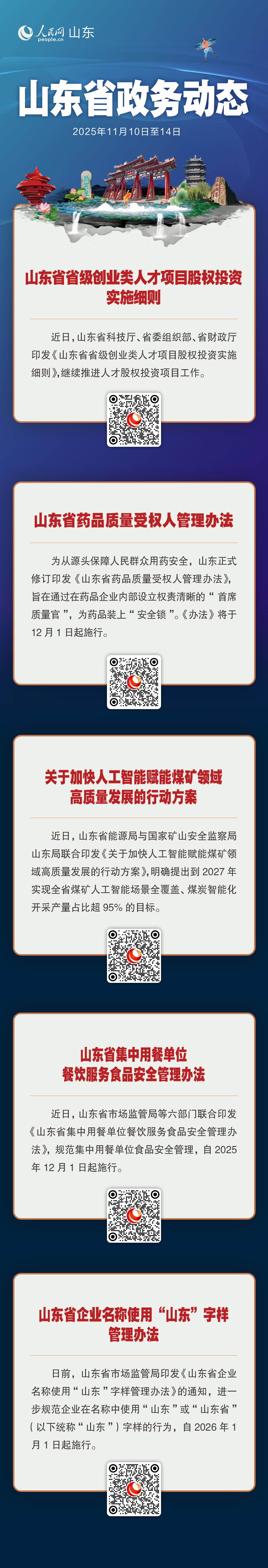 具体如下:人 平易近 网 股 份 有 限 公 司 版 权 所 有 ,未 经 书 面 授 权 禁 止 使 用人平易近日概况关于人平易近网聘请聘请英才告白办事合做加盟供稿办事数据办事网坐声明网坐律师消息联系我们本周(11月10日至11月14日)山东出台《省级创业类人才项目股权投资实施细则》《药质量量受权人办理法子》《关于加速人工智能赋能煤矿范畴高质量成长的步履方案》《集顶用餐单元餐饮办事食物平安办理法子》《企业名称利用“山东”字样办理法子》,